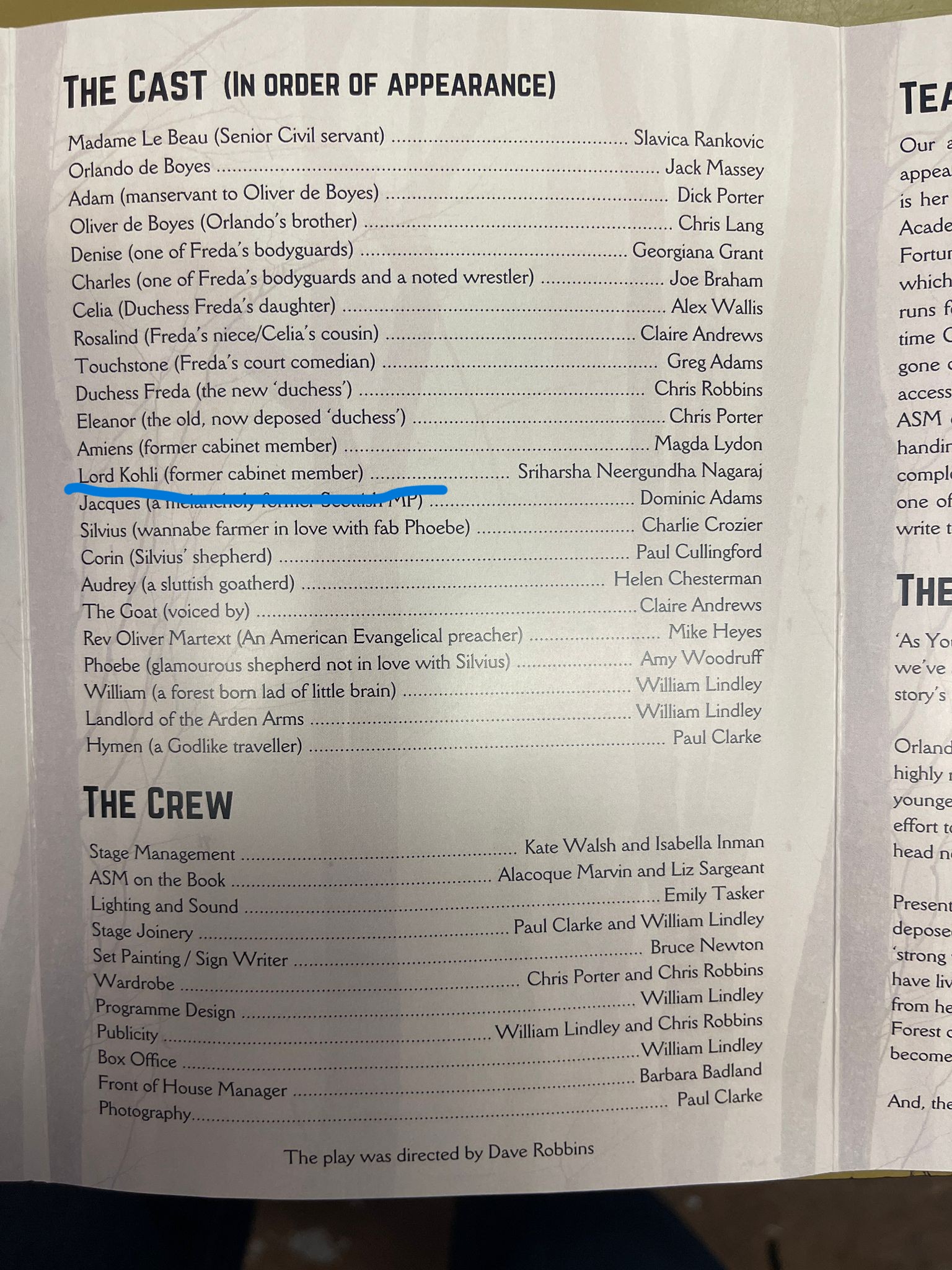 ಅವರೊಂದಿಗೆ ಡ್ಯೂಕ್ ಸೀನಿಯರ್, ಡ್ಯೂಕ್ ಫ್ರೆಡರಿಕ್, ಒಲಿವರ್, ಸಿಲ್ವಿಯಸ್, ಫೀಬಿ, ಕೊರಿನ್, ಆಡ್ರಿ, ವಿಲಿಯಂ ಮತ್ತು ಇನ್ನೂ ಹಲವರು ಸೇರಿದ್ದರು.