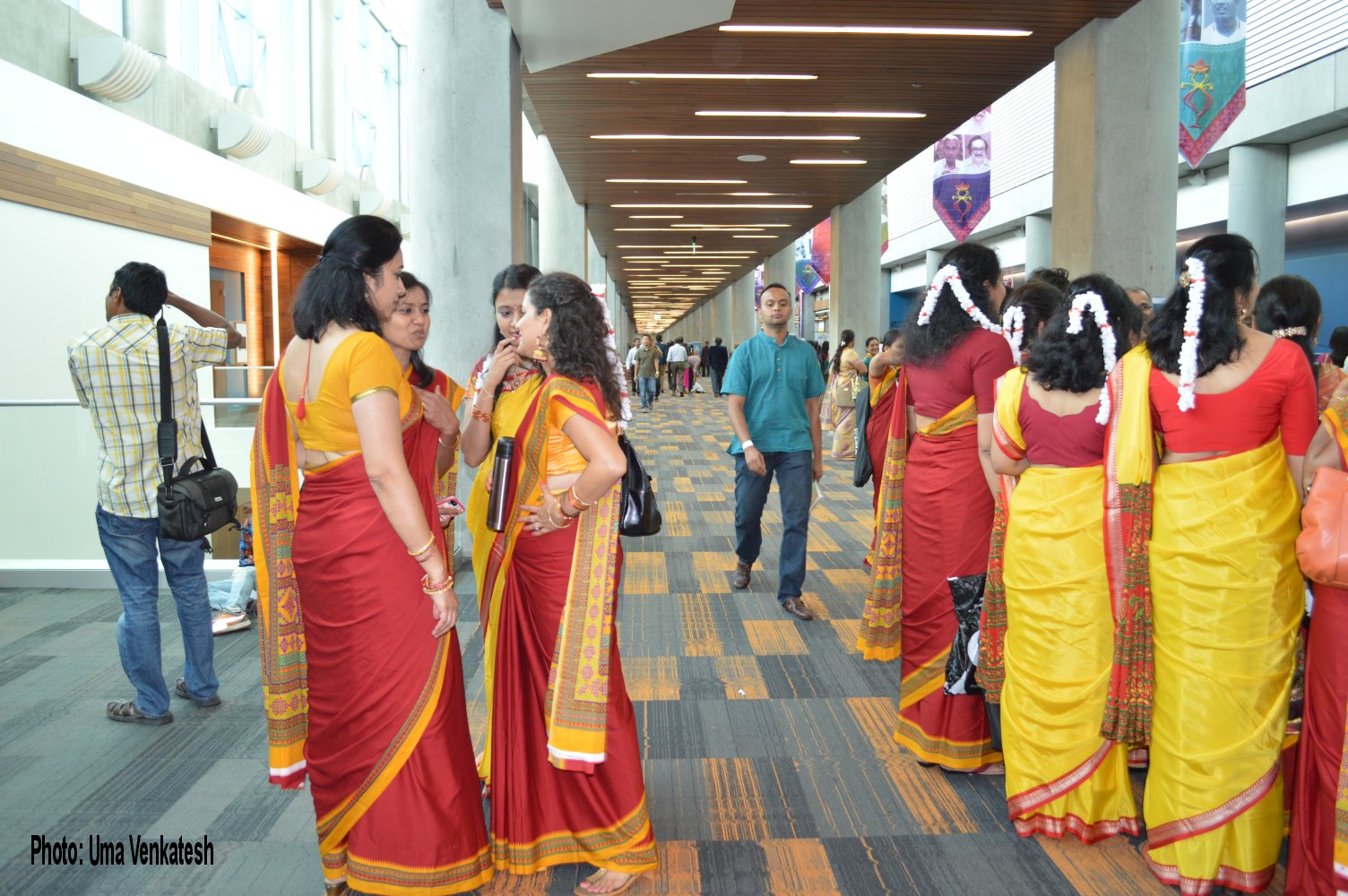 Photo: Uma Venkatesh                                        ನೋಂದಣಿಯನ್ನು ಅಲ್ಲಿನ ವೃತ್ತಿಪರ ಮಾಹಿತಿ ತಜ್ಞರು ಬಹಳ ಸುಲಲಿತವಾಗಿ ಅಚ್ಚುಕಟ್ಟಾಗಿ ಏರ್ಪಡಿಸಿದ್ದರು. ನಮ್ಮ ಬ್ಯಾಡ್ಜ್ ಮತ್ತು ೩ ದಿನಗಳ ಕಾರ್ಯಕ್ರಮದ ರಸದೌತಣವನ್ನು ಹೊತ್ತ ಫಲಕದ ಕಿರುಹೊತ್ತಿಗೆಯನ್ನು ತೆಗೆದುಕೊಂಡು, ಸಭಾಂಗಣದ ವೀಕ್ಷಣೆಗೆ ತೆರೆಳಿದೆವು. ಈ ಸಭಾಂಗಣದಲ್ಲಿ, ಸುಮಾರು ೩ ಸಹಸ್ರ ಮಂದಿ ಒಟ್ಟಿಗೆ ಕುಳಿತು ಕಾರ್ಯಕ್ರಮವನ್ನು ವೀಕ್ಷಿಸಲು, ಊಟ ಮಾಡಲು ಸಾಧ್ಯವಿರುವ ಬೃಹತ್ ಹಾಲುಗಳಿವೆ. ನಮ್ಮ ಕನ್ನಡದ ಶೈಲಿಯಲ್ಲಿ ಈ ಸಭಾಂಗಣಗಳಿಗೆ ನಮ್ಮೂರಿನ ನೆಚ್ಚಿನ ಕುಸುಮಗಳ ಹೆಸರುಗಳಾದ ಮಲ್ಲಿಗೆ, ಸಂಪಿಗೆ, ಕಣಿಗಿಲೆ, ನೈದಿಲೆ, ಪಾರಿಜಾತ, ಕಮಲ, ಸ್ಫಟಿಕ, ಮಂದಾರ, ಸೇವಂತಿಗೆ, ಸೂರ್ಯಕಾಂತಿ ಎನ್ನುವ ಹೆಸರುಗಳನ್ನಿತ್ತು ಅಲ್ಲಿ ಪರ್ಯಾಯವಾದ ಕಾರ್ಯಕ್ರಮಗಳನ್ನು ನಡೆಸುವ ಸಿದ್ಧತೆಯಿತ್ತು. ಭೋಜನ ಶಾಲೆಗೆ “ಅನ್ನಪೂರ್ಣ” ಎಂಬ ಸೊಗಸಾದ ನಾಮಕರಣವಿತ್ತು. ಎಲ್ಲಾ ಸದಸ್ಯರೂ ಮೇಜಿನ ಸುತ್ತಾ ಕುಳಿತು, ಭೋಜನವನ್ನು ಸವಿಯುವ ಏರ್ಪಾಡಿತ್ತು.