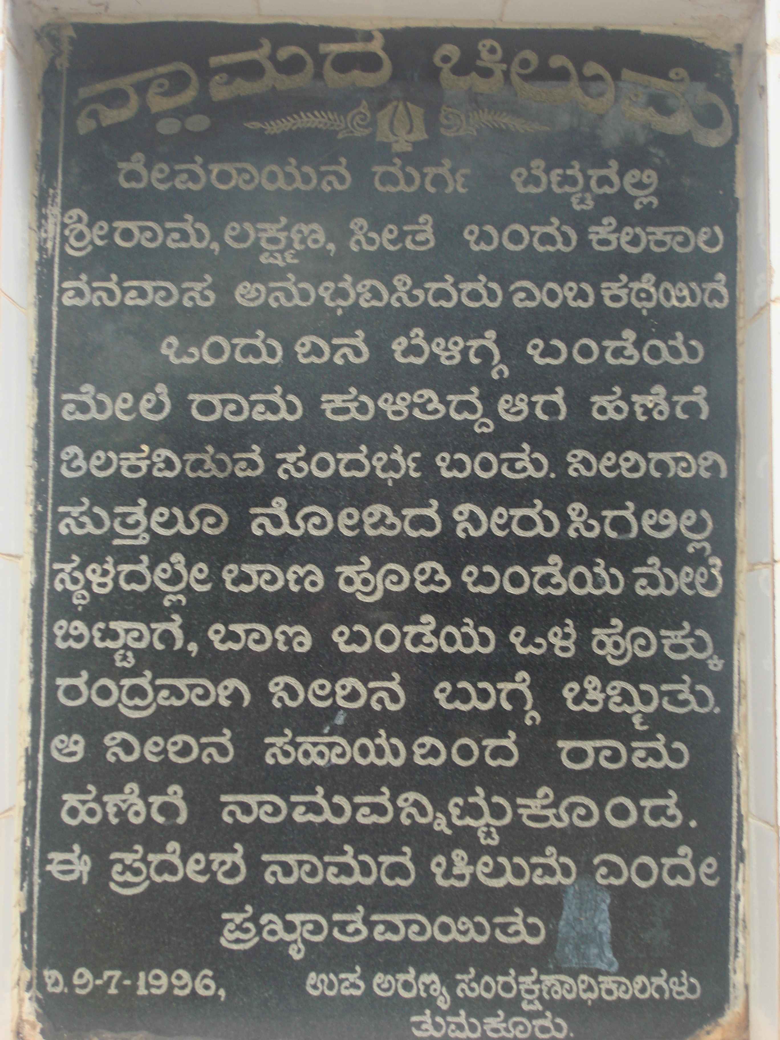 ರಾಮ ವನವಾಸದಲ್ಲಿದ್ದ ಸಮಯದಲ್ಲಿ ಇಲ್ಲಿಗೆ ಬಂದಿದ್ದನಂತೆ. ತನ್ನ ನಾಮವನ್ನು ತೇಯಲು ನೀರು ಸಿಗದ ಕಾರಣ, ತಾನು ಕೂತಿದ್ದ ಬಂಡೆಗೇ ಬಾಣ ಬಿಟ್ಟು ಅಂತರ್ಜಲ ಚಿಮ್ಮುವಂತೆ ಮಾಡಿದನಂತೆ. ಹೀಗಾಗಿ ಇದು ನಾಮದ ಚಿಲುಮೆಯಾಯಿತು. ಇಲ್ಲಿ ಸರ್ಕಾರ ಒಂದು ಜಿಂಕೆವನವನ್ನು ಮಾಡಿದೆ. ಇಲ್ಲಿನ ಅರಣ್ಯದಲ್ಲಿ ಆಗೀಗ ಚಿರತೆಗಳ ಹಾವಳಿ ನಡೆಯುತ್ತಲೇ ಇರುತ್ತದೆ. ಮಾಧ್ಯಮಿಕ ಶಾಲೆಯನ್ನು ಬಿಟ್ಟ ೧೫ ವರ್ಷಗಳ ನಂತರ  ನಾವೆಲ್ಲ ಮತ್ತೆ ಸೇರಿದ್ದು ಇಲ್ಲಿಯೇ!