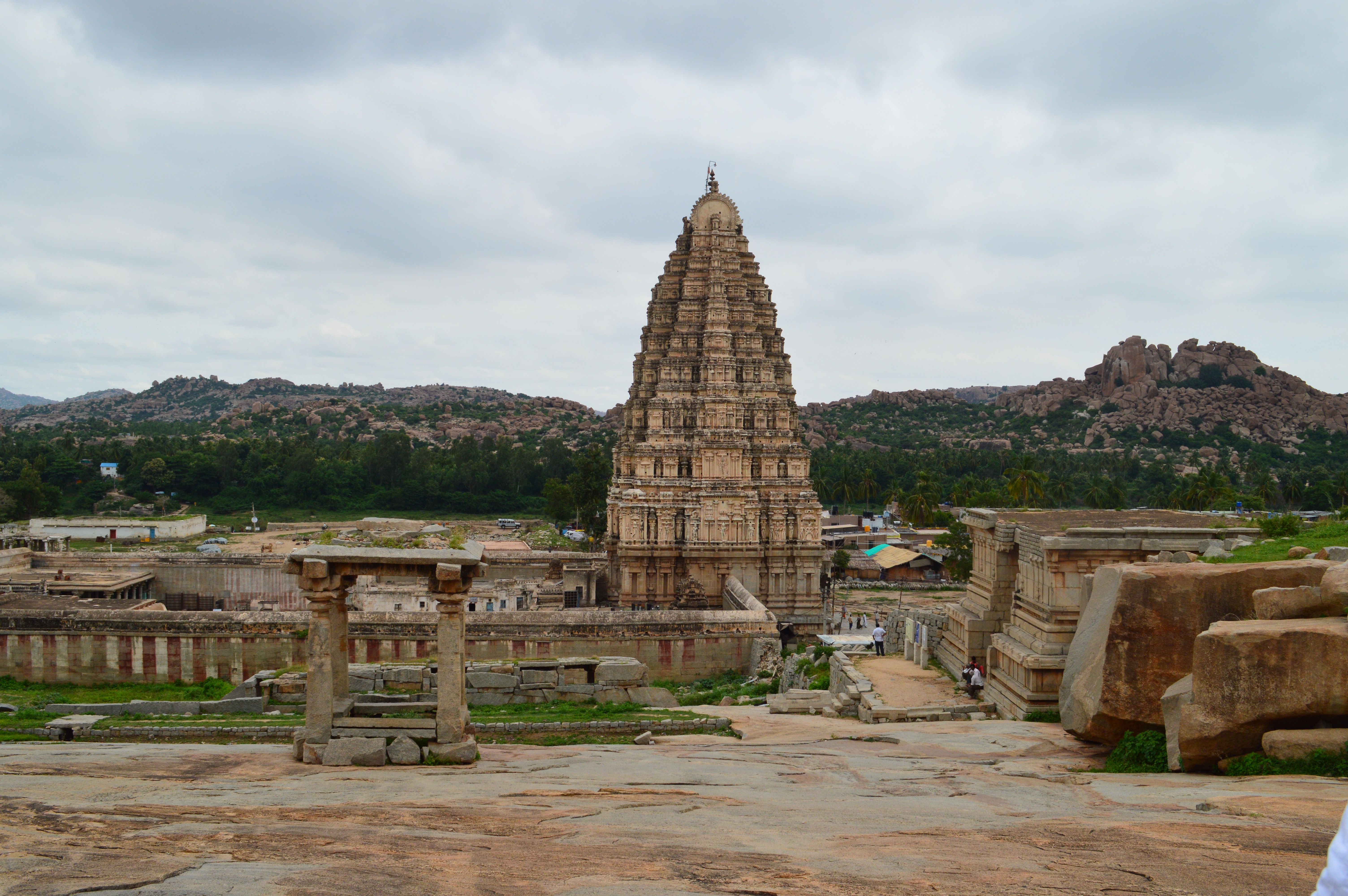 ಅಲ್ಲಲ್ಲೇ ಬಂಡೆಗಳ ಮೇಲೆ ಕೆತ್ತಿರುವ ಶಾಸನಗಳ ಬಗ್ಗೆ ಕೇಳುತ್ತಾ ಹೋದೆವು. ಕಡೆಗೆ ವಿರೂಪಾಕ್ಷ ದೇವಾಲಯದ ಭವ್ಯ ಗೋಪುರ ನಮ್ಮ ದೃಷ್ಟಿಗೆ ಬಿತ್ತು. ಸುಮಾರು ೭ನೆಯ ಶತಮಾನದಿಂದಲೂ ಇರುವ ಈ ದೇವಾಲಯ, ವಿಜಯನಗರದ ಅರಸರ ಸಮಯದಲ್ಲಿ, ಒಂದು ಭವ್ಯವಾದ ದೇವಾಲಯ ಮತ್ತು ಸುತ್ತಮುತ್ತ ಭವ್ಯ ಕಟ್ಟಡಗಳ ಒಂದು ಸಂಕೀರ್ಣವಾಗಿ ರೂಪುಗೊಂಡಿತಂತೆ. ವಿಜಯನಗರದ ಅರಸ ೨ನೆಯ ದೇವರಾಯನ ಕಾಲದಲ್ಲಿ ನಿರ್ಮಿತವಾದ ಈ ದೇವಸ್ತಾನ, ಇಂದು UNESCO ಸಂಸ್ಥೆಯ ಪರಂಪರೆಯ ಸ್ಥಳವೆಂಬ ಗೌರವ ಪಡೆದಿದೆ. ಹಾಗಾಗಿ, ದೇವಾಲಯದ ಸುತ್ತಮುತ್ತಾ ಯಾವ ಅಂಗಡಿ ಮುಂಗಟ್ಟುಗಳೂ ಇಲ್ಲ. ಹಿಂದಿದ್ದ ಎಲ್ಲಾ ವ್ಯಾಪಾರ ಕಟ್ಟಡಗಳನ್ನು ತೆಗೆದು ಹಾಕಿದ್ದಾರೆ. ಆದರೇನು, ಬರುವ ಜನಗಳ ಕೈಯಿನ ಹೂವು, ಹಣ್ಣು ತೆಂಗಿನಕಾಯಿಗಳನ್ನು ಕಿತ್ತು ಪರಾರಿಯಾಗುವ ಮಂಗಗಳ ಹಿಂಡನ್ನಂತೂ ಯಾರೂ ತೆಗೆದುಹಾಕಲು ಸಾಧ್ಯವಿಲ್ಲ! ವಾಲಿ, ಸುಗ್ರೀವ ಮತ್ತು ಹನುಮಂತರ ಪ್ರತಿನಿಧಿಗಳಾಗಿ ಇಲ್ಲಿರುವ ಕಪಿಗಳು, ರಾಮಾಯಣದ ಕಥೆಯ ಪ್ರತೀಕವಾಗಿ ಇಲ್ಲಿ ಇನ್ನೂ ಓಡಾಡುತ್ತಾ, ತಮ್ಮ ನೆಲೆ ಕಂಡುಕೊಂಡಿವೆ!