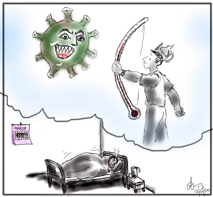 ಹೀಗೆಯೇ. ಈಗ ಇನ್ನೊಂದು ತರದ ಕೊರಾಯಣವನ್ನು ಕೊಟ್ಟಿದ್ದಾರೆ ಲಕ್ಷ್ಮಿನಾರಾಯಣ ಗುಡೂರು ಅವರು. ಓದಿ ಮುದಕೊಟ್ಟಿತು. ಪ್ರಸ್ತುತ ಸ್ಥಿತಿಗೆ ಹೋಲಿಸಿ ರಾಮನ ಮೇಲಿನ ಗೌರವ ಹೆಚ್ಚೇ ಆಯಿತು ಅನ್ನಿ. ಈಗಿನ ರಾಮನ ಸಂಕಟ ನೋಡಿ ಸ್ವಲ್ಪವಾದರೂ ಕನಿಕರ ಆದರೆ ಆಶ್ಚರ್ಯವಿಲ್ಲ. ಅವರ ಹಿಂದಿನ ಕೊರೋನಾ ವ್ಯಂಗ ಚಿತ್ರದಲ್ಲಿ ಆತ ರೋಮನ್ ಯೋಧ , ಇದರಲ್ಲಿ ಆತ ತ್ರೇತಾಯುಗಕ್ಕೆ ಸರಿದಿದ್ದಾನೆ! ಜ್ವರದ ಕಾವೇರಿ ಥರ್ಮಾಮೀಟರಿನ ಬಿಲ್ಲು ಬಾಗಿದೆ. ಅರ್ಥಪೂರ್ಣ ಹಾರ್ಟೂನ್. ಕಾವ್ಯದ ವಸ್ತು ಅದೇ ಕೊರೋನಾ ಆದರೂ ಇದರಲ್ಲಿಯ ಹೊಸ ನಿರೂಪಣೆಗೆ ಚಪ್ಪಾಳೆ!