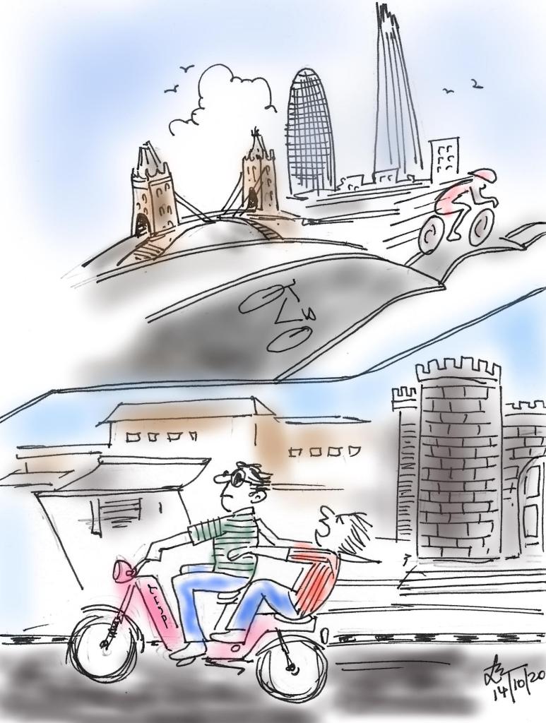 ಇಂದಿನ ಎರಡೂ ಕವನಗಳು ನಾನು ಶಾಲೆಯಲ್ಲಿ ಓದಿ ಆನಂದಿಸಿದ Henry Charles Beeching ಬರೆದ Going Down Hill on a Bicycle – A Boy’s song-ಅನ್ನು -ನೆನಪಿಗೆ ತಂದವು. ಮುರಳಿಯವರಂತೆ ಕತ್ತರಿ ಹೊಡೆದೋ ಸೀಟಿನಮೇಲೆ ಕುಳಿತೋ, ಎತ್ತಿಯೋ ತಿಣುಕಿ ಎತ್ತರದ ‘ಶಿಖರ’ದಿಂದ ‘ಹಾರುತ್ತ’ ಕೆಳಗೆ ಬರುವ ಆನಂದವನ್ನು ಅನುಭವಿಸಿದವರಿಗೇ ಗೊತ್ತು. ಬ್ರೇಕ್ ಇಲ್ಲದ ಲೂನಾ ಸವಾರಿ ಮಾಡುವಾಗ ಗೂಡು ಬಿಟ್ಟ ‘ಎಲ್ಲೆನ್’ ಅವರು ಚಂದ್ರನ ಮೇಲಿದ್ದಂತೆ ಗುರುತ್ವಾಕರ್ಷಣೆ ಮೀರಿ ಹಾರಿ ಹರಕು ಸೀಟಿನ ಮೇಲೆ ಕುಪ್ಪಳಿಸುವ ದೃಶ್ಯ ನೆನೆದು ಮುಗುಳ್ನಕ್ಕವರೇ ಎಲ್ಲ! ಅವರ ವ್ಯಂಗ ಚಿತ್ರಗಳು ಎಂದಿನಂತೆ ನೂರಾರು ಡಿಟೇಲ್ಸ್ ಹೊತ್ತು ಲಂಡನ್ನಿನ ಮುರಳಿ, ಪುಣೆಯ ಗಾಳಿ ಕಣ್ಣಿಗೆ ತರುತ್ತವೆ. ಇವುಗಳಡಿಯಲ್ಲಿಯ ದರ್ಶನವನ್ನೂ ಗಮನಿಸಬೇಕು. ‘ಒಮ್ಮನದ ಏಕಾಂತದಲಿ ಲೀನ /ಹ್ಯಾಂಡಲ್ ಪೆಡಲ್ ಮತ್ತು ನಾನು’ ಸಾಲುಗಳಲ್ಲಿ ಮತ್ತು ಬೀಚಿಂಗ್ ನ ಪದ್ಯದ ಕೊನೆಯ ಸಾಲುಗಳಲ್ಲಿಯ ನಿತ್ಯ ಸತ್ಯದ ಸಾಮ್ಯತೆ ಸರಳ ಮಕ್ಕಳ ಕವಿತೆಗಳಲ್ಲೂ ಕವಿ ಕೊಡುವ ಸಂದೇಶಕ್ಕೆ ಬೆರಗಾಗುತ್ತೇವೆ.