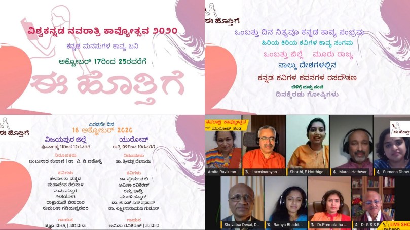 ಇನ್ನು ಭಾನುವಾರ ಮಧ್ಯಾಹ್ನ ೪ ಘಂಟೆಗೆ (UK ಸಮಯ) ಸರಿಯಾಗಿ ನಾವೆಲ್ಲಾ ಸ್ಟ್ರೀಮ್ ಯಾರ್ಡ್ ಕದ ತಟ್ಟಿ ಒಳಗೆ ಹೋಗಿ ಕುಳಿತೆವು. ‘ಈ ಹೊತ್ತಿಗೆ’ಯ ವತಿಯಿಂದ ಶ್ರುತಿ ಅವರು ನಮ್ಮನ್ನು ಸ್ವಾಗತಿಸಿದರು. ಅವರ ಸ್ಪಷ್ಟ ಮಾತು ಕೇಳಲು ನಿಜಕ್ಕೂ ಹಿತವಾಗಿತ್ತು.  ನಂತರ ನಮ್ಮ ಕಾರ್ಯಕ್ರಮದ ಚುಕ್ಕಾಣಿ ಹಿಡಿದಿದ್ದು ಶ್ರೀವತ್ಸ ದೇಸಾಯಿ ಅವರು. ಅನಿವಾಸಿ ಬಳಗದ ‘ಈ  ಹೊತ್ತಿಗೆ’ಯ ನವರಾತ್ರಿ ಕಾವ್ಯೋತ್ಸವವನ್ನ  ಪ್ರೇಮಲತ ಅವರು ತಮ್ಮ ಕವಿತೆಯಲ್ಲಿ ದುರ್ಗೆಯನ್ನು ಮತ್ತೆ ಹುಟ್ಟಿಬಾ ಎನ್ನುತ್ತಾ ಆರಂಭಿಸಿದರು. ನಂತರ ನಾನು ಕೇಳಿಸಿಕೊಂಡ ಪ್ರತಿ ಕವಿತೆಯೂ ಅದೆಷ್ಟು ಸುಂದರವಾಗಿ, ವಿಭಿನ್ನ ಶೈಲಿಯೊಂದಿಗೆ ಮನಮೋಹಕವಾಗಿ ಮೂಡಿ ಬಂದವು.