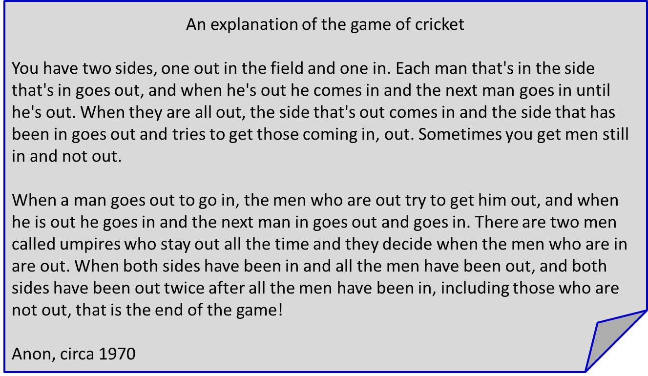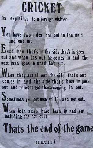 ಆಂಗ್ಲರ ಟಿ ಕುಡಿಯುವ ಚಟ, ಮಧ್ಯಾಹ್ನದ ಟೀ ಬ್ರೆಕ್ ಇವೆಲ್ಲ ಅವರ ಕಲ್ಚರ್ ನಲ್ಲಿ ಹಾಸು ಹೊಕ್ಕಾಗಿರುವದು ಎಲ್ಲರಿಗೂ ಗೊತ್ತೇ ಇದೆ. ಅದರೆ ಹಿಂದೆಯೇ ಬಂದದ್ದು ಟೀ ಟ್ರೆ ಮೇಲಿನ ತಿಂಡಿಗಳ ಮೇಲೆ ಚಹದ ಹನಿ ಬೀಳದಿರಲೆಂದು ಹೊದಿಸುವ ಟೀ ಟವಲ್ ಮತ್ತು ವಿವಿಧ ತರಹದ ಟೀ ಟವೆಲ್ ಸಂಗ್ರಹಿಸುವ ಹವ್ಯಾಸ. ಪರದೇಶದವನಿಗೆ (ಅಮೆರಿಕನ್ ಅನ್ನಿರಿ) ಕ್ರಿಕೆಟ್ ಆಟದ ಪರಿಚಯ ಮಾಡಿಕೊಡುವ ಟೀ ಟವಲ್ ಮಾರಾಟ 1970 ರ ದಶಕದಲ್ಲಿ ಅರಂಭವಾಯಿತು. ನನ್ನ ಹತ್ತಿರವೂ ಒಂದು ಇದೆ. ಆ ಕ್ರಿಕೆಟ್ ಟದ ನಿಯಮಗಳ ವಿವರಣೆ ಬಹಳ ತಮಾಷೆಯಾಗಿದೆ, ಆದರೂ ನಿಜ. ಓದಿ ನೋಡಿ.