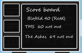 1782-83 ದಲ್ಲಿ ಶುರುವಾದ ಇಂಗ್ಲೆಂಡ್ ಮತ್ತು ಆಸ್ಟ್ರೇಲಿಯಾ ಮಧ್ಯೆ ಆಶಿಸ್ (Ashes) ಪಂದ್ಯದ 70 ನೆಯ ಸರಣಿ ಈ ವರ್ಷ ನಡೆಯುತ್ತೆ. ಬಿ.ಬಿ.ಸಿ. ರೇಡಿಯೋದಲ್ಲಿ ಕಾಮೆಂಟ್ರಿ ಕೇಳಿ ಆನಂದಿಸಿ. ನನ್ನ ಪ್ರಕಾರ ಇನ್ನಾವ ದೇಶದಲ್ಲೂ ಟಿ ಮ್ ಸ್ ಸಮಾನ ಇಲ್ಲ,