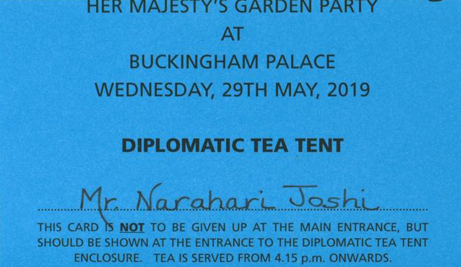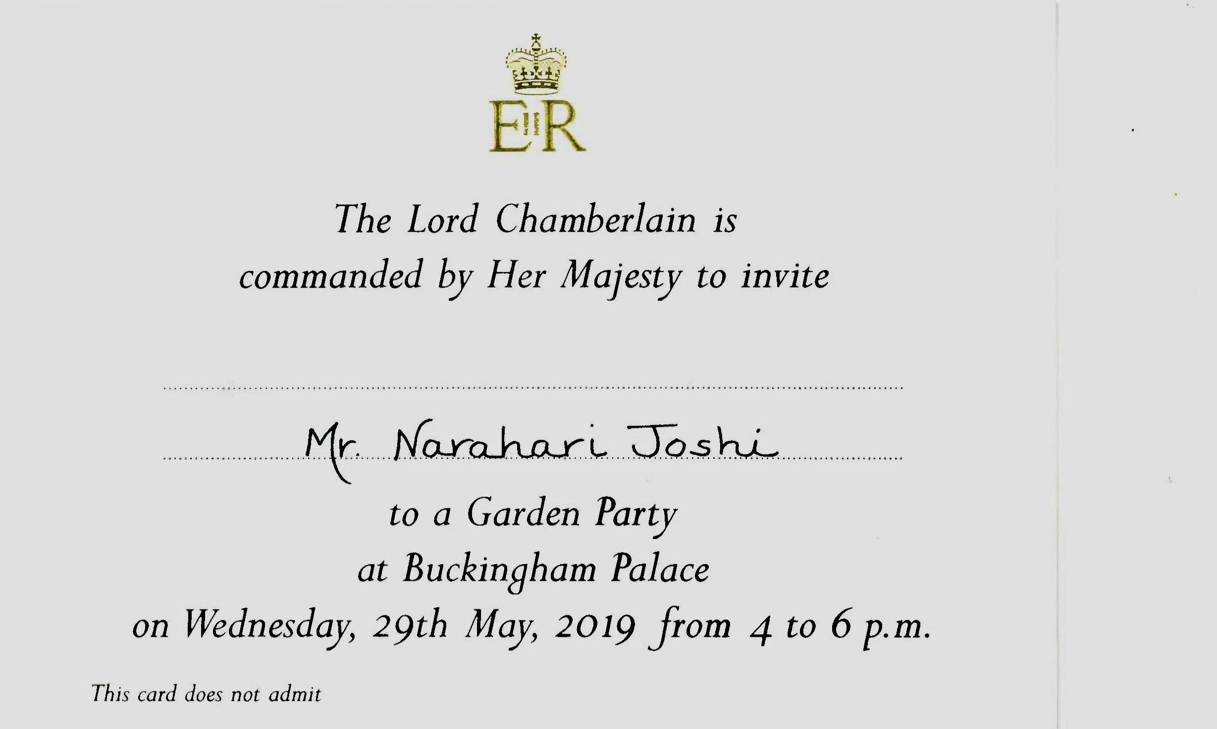 ಇದೇ ವರ್ಷದ ಮೇ ತಿಂಗಳಿನಲ್ಲಿ ಒಂದು ದಿನ ಟಪಾಲಿನಲ್ಲಿ ಬಂದ ಲಕೋಟೆಯನ್ನು ಬಿಚ್ಚಿ ನೋಡಿದಾಗ ನಂಬಲಿಕ್ಕೇ ಆಗಲಿಲ್ಲ. ಬ್ರಿಟನ್ನಿನ ರಾಣಿಯ ಗಾರ್ಡನ್ ಪಾರ್ಟಿಗೆ ಅಹ್ವಾನ ಪತ್ರ! ಇದು ಕನಸೇ, ನನಸೇ? ಬುಧವಾರ ಮೇ 29ನೆಯ ತಾರೀಕು ನಾನು ಮತ್ತು ನನ್ನ ಮಡದಿ ಬಕಿಂಗ್ಯಾಂ ಅರಮನೆಯ ತೋಟದಲ್ಲಿ ಹಾಜರಿರಬೇಕಂತೆ, ರಾಜ ಮನೆತದವರನ್ನು ಭೇಟಿಮಾಡುವ ಈ ಸದವಕಾಶ ನನ್ನ ಪಾಲಿಗೆ ಬಂದದ್ದು ಸುದೈವ ಅಂದುಕೊಂಡೆ..