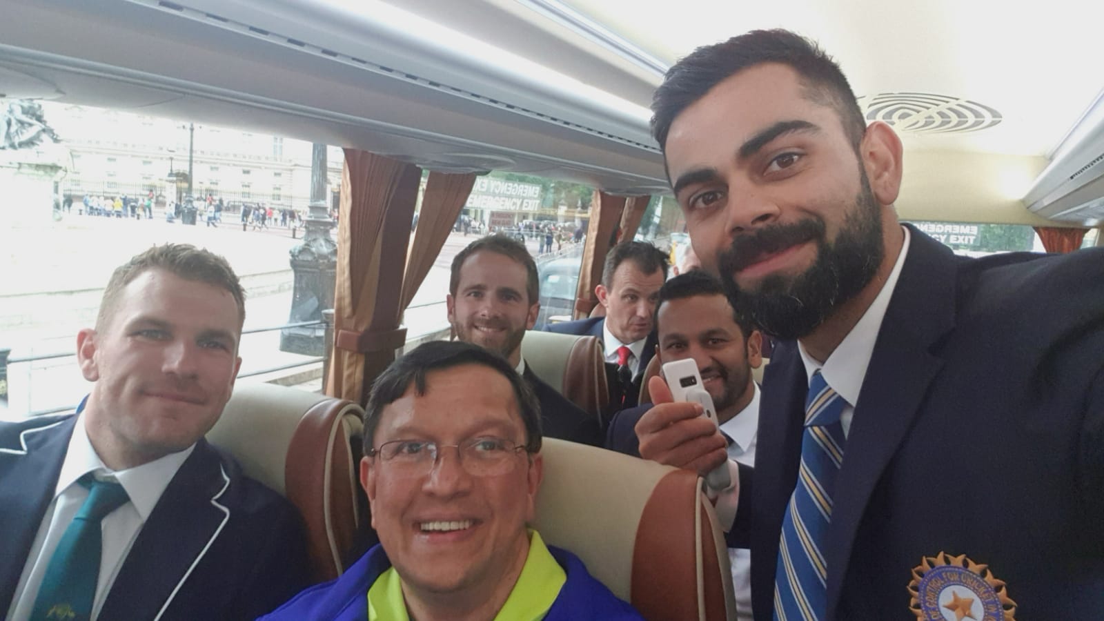 ಅರಮನೆಯಲ್ಲಿ ಮಹಾರಾಣಿಯ ಮತ್ತು ರಾಜಕುಮಾರರ ಭೇಟಿ ಆದ ಬಳಿಕ ಅಲ್ಲಿಂದ ಸೀದಾ ವರ್ಲ್ಡ್ ಕಪ್ ಪಂದ್ಯಾಟಗಳ ಉದ್ಘಾಟನಾ ಸಮಾರಂಭದಲ್ಲಿ ಪಾಲ್ಗೊಳ್ಳಲಿಕ್ಕೆ ಹೋಗುವುದು ನಮ್ಮ ಕಾರ್ಯಕ್ರಮವಾಗಿತ್ತು. 16 ಸೀಟುಗಳ ಬಸ್ಸಿನಲ್ಲಿ ಹೋಗುವಾಗ ನಾನು ಕುಳಿತುಕೊಂಡಿದ್ದು ಆಸ್ಟ್ರೇಲಿಯಾ ತಂಡದ ನಾಯಕ ಆರನ್ ಫಿಂಚ್ ಮತ್ತು ನಮ್ಮ ಭಾರತ ತಂಡದ ನಾಯಕ ವಿರಾಟ್ ಕೋಹ್ಲಿ ಅವರ ಪಕ್ಕದಲ್ಲಿ! ನನ್ನ ಕೈಯಲ್ಲಿ ಮೊಬೈಲ್ ಫೋನ್ ಇರುವುದನ್ನು ಕೊಹ್ಲಿ ಗಮನಿಸಿದರು. “ಅಪರೂಪದ ಈ ಸಂದರ್ಭದಲ್ಲಿ ಒಂದು ಸೆಲ್ಫಿ ತೆಗೆದುಕೊಂಡರೆ ಬಂಧುಮಿತ್ರರೊಂದಿಗೆ ಹಂಚಿಕೊಳ್ಳಬಹುದು” ಎಂದು ನನ್ನ ತಲೆಯಲ್ಲಿ ಓಡುತ್ತಿದ್ದ ಆಲೋಚನೆಯನ್ನು ಅವರಾಗಿಯೇ ಗ್ರಹಿಸಿದರೋ ಎಂಬಂತೆ ಕೊಹ್ಲಿ ನನ್ನ ಮೊಬೈಲ್ ಫೋನ್ ತಗೊಂಡು “ಇಲ್ಲಿ ಕೊಡಿ, ನಾನೇ ಸೆಲ್ಫಿ ಕ್ಲಿಕ್ ಮಾಡುತ್ತೇನೆ!” ಎಂದರು. ಅದ್ಭುತವಾದೊಂದು ಸೆಲ್ಫಿ ಕ್ಲಿಕ್ ಮಾಡಿ ಫೋನ್ ನನ್ನ ಕೈಗಿತ್ತರು. ನನ್ನ ಪಾಲಿಗೆ ಅದೊಂದು ಸುವರ್ಣಾಕ್ಷರಗಳಲ್ಲಿ ಬರೆದಿಡಬಹುದಾದ ಕ್ಷಣ! ಕೋಹ್ಲಿಗೆ ಧನ್ಯವಾದ ಸಲ್ಲಿಸುತ್ತ ಕ್ರಿಕೆಟ್ ಟೂರ್ನಮೆಂಟ್ನಲ್ಲಿ ಬೆಸ್ಟ್ ಆಫ್ ಲಕ್ ಹೇಳಿದೆ. ಅದಕ್ಕಿಂತ ಹೆಚ್ಚಾಗಿ ನನ್ನದು ಎಂಥ ಲಕ್ ಎಂದು ಸಂಭ್ರಮಪಟ್ಟುಕೊಂಡೆ.