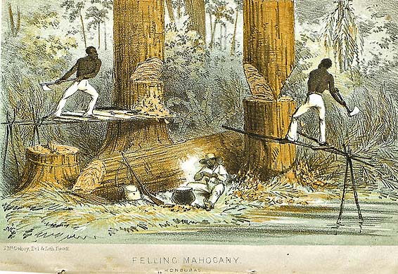 ಮೆಕ್ಸಿಕೋದ ದಕ್ಷಿಣದ ಆಗಿನ ಬ್ರಿಟಿಶ್ ಹೊಂಡುರಾಸ್ (ಈಗಿನ ಬೆಲೀಜ್ ದೇಶದ)”ಮಸ್ಕಿಟೋ ಬೇ’ ಪ್ರದೇಶದಲ್ಲಿ ಬೆಳೆದ ಉತ್ತುಂಗ ಮಹೋಗನಿ ಮರಗಳನ್ನು ಪಶ್ಚಿಮ ಆಫ್ರಿಕದ ಇಬೋ ಮತ್ತು ಯರುಬಾ ಎನ್ನುವ ಬುಡಕಟ್ಟು ಜನಾಂಗದವರು ಕಡಿಯುತ್ತಿದ್ದರು. ತಮ್ಮ ಊರಲ್ಲಿಯೂ ಇದೇ ತರದ ಖಯಾ ಮರಗಳಿಗೆ ’ಮೊಗಾನ್ವೋ’ (‘m’oganwo’) ಅಂತ ಕರೆಯುತ್ತಿದ್ದರಂತೆ. ಅದೇ ಮಹೋಗನಿ ಆಯಿತು ಅಂತ ಒಂದು ವಾದ. ಗುಲಾಮರು ಮರಗಳನ್ನು ಕೊಡಲಿಯನ್ನು ಪಯೋಗಿಸಿ ಕೈಯಿಂದಲೆ