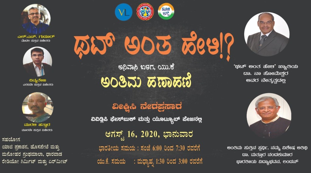 ಕಳೆದ ರವಿವಾರ (19-7-2020) ಯು ಕೆ ದ ’ಅನಿವಾಸಿ ಬಳಗದ’ ನಾಲ್ವರು ಸ್ಪರ್ಧಿಗಳೊಡನೆ ಸೋಮೇಶ್ವರ ಅವರು ಎರಡನೆಯ ಸುತ್ತಿನ ಕ್ವಿಜ್ ಕಾರ್ಯಕ್ರಮ ನಡೆಸಿ ಕೊಟ್ಟರು. ಇದಕ್ಕೆ ವಿವಿಡ್ಲಿಪಿ (www.vividlipi.com)ಯವರು ಕೊಟ್ಟ ತಾಂತ್ರಿಕ ಸಹಾಯ, ಪುಸ್ತಕಗಳ ದೇಣಿಗೆ ಮತ್ತು ಪ್ರಚಾರದ ಸಹಾಯವನ್ನು ”ಅನಿವಾಸಿ” ಇಲ್ಲಿ ಇಂದು ಸ್ಮರಿಸುತ್ತದೆ. ಆ ಯಶಸ್ವಿ ಕಾರ್ಯಕ್ರಮದಲ್ಲಿ ಪಾಲುಗೊಂಡ ಕೆಲವರ ಅನಿಸಿಕೆಗಳನ್ನು ಈ ಲೇಖನದ ಕೊನೆಯಲ್ಲಿ ಕೊಟ್ಟಿದೆ. ಇಂಗ್ಲೆಂಡಿನಲ್ಲಿಯ ”ಅನಿವಾಸಿ’’ ಎನ್ನುವ ಜಾಲ ಜಗುಲಿ (ಇ-ಪೇಪರ್) ಯಲ್ಲಿ ಮೊದಲ ಸುತ್ತಿನ ವಿವರಗಳನ್ನು (https://wp.me/p4jn5J-2K5) ಜುಲೈ 10ರ ಸಂಚಿಕೆಯಲ್ಲಿ ಈಗಾಗಲೇ ಕೊಟ್ಟಿದೆ. ಅದರಲ್ಲಿ ಕ್ವಿಜ್ ಮಾಸ್ಟರ್ ಮತ್ತು ’ಅನಿವಾಸಿ’ ಮತ್ತು ’ಕಸಾಸಾಂವಿವೇ’(KSSVV) ಸಂಘಟನೆಯ ಕಿರು ಪರಿಚಯವನ್ನೂ ಮಾಡಿಕೊಡಲಾಗಿತ್ತು.