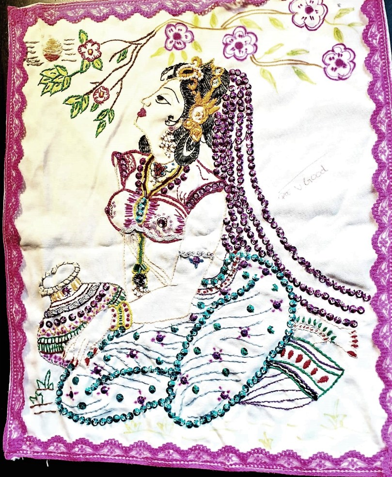 ಒಂದು painting ತೆಗೆದುಕೊಂಡು ಹಾಕಿದ್ದ ಕಸೂತಿ ಇದು. ಜಯಲಕ್ಷ್ಮಿ ಮಿಸ್ ಯಿಂದ ‘ V Good’ ಎಂದು ಕೆಂಪು ಶಾಹಿಯಲ್ಲಿ ಬಿದ್ದ ಸಹಿ ಮನಸ್ಸಿಗೆ ಏನೋ ಸಾಧಿಸಿದ ಹಾಗೆ ಪರಮಾನಂದ.
